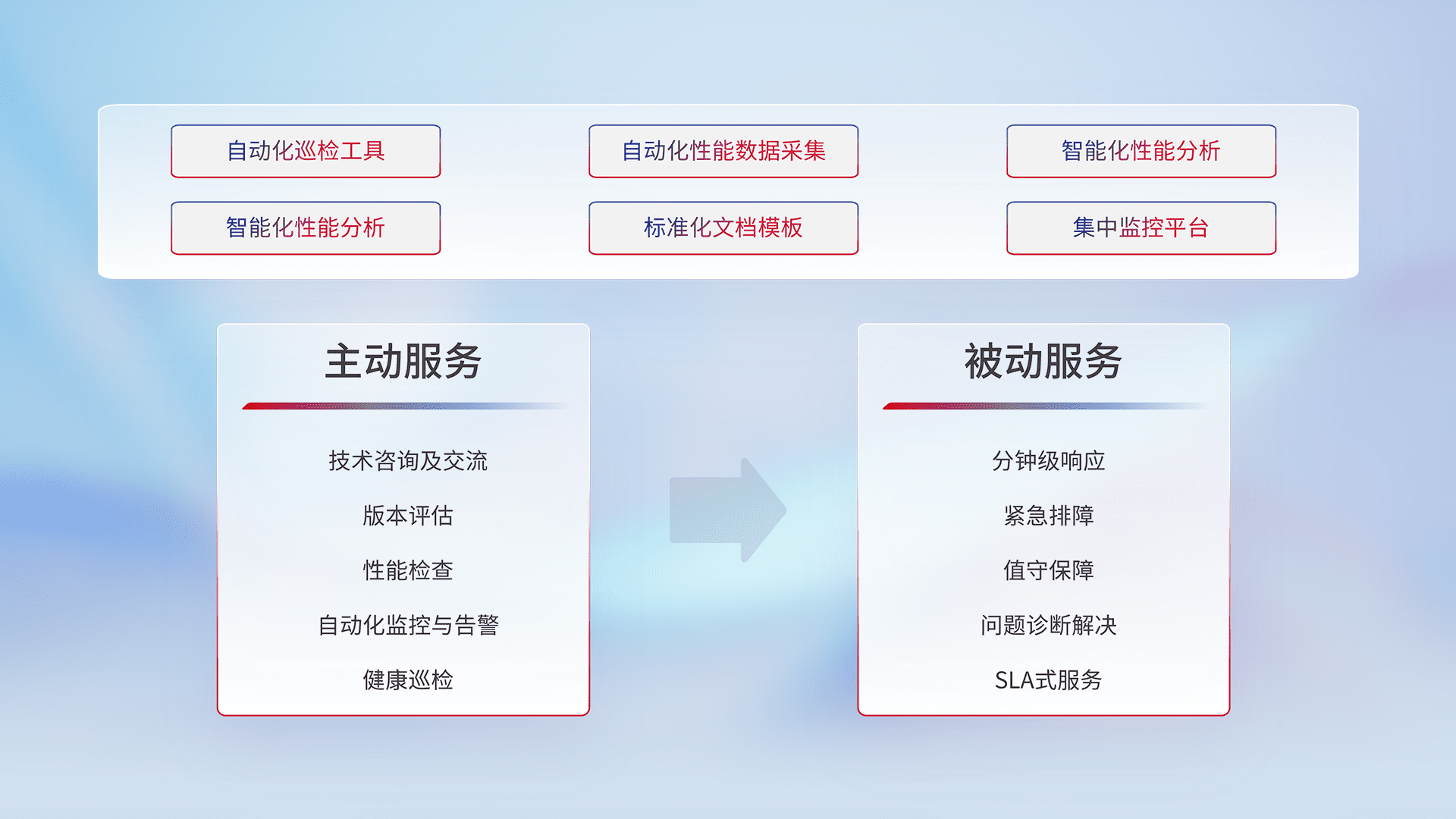 智能化工具和标准化文档,,保障服务质量,,,,提供主动服务(包含技术咨询、、、版本评估、、、性能检查、、自动化监控与告警、、、健康巡检)和被动服务包含(分钟级响应、、、紧急排障、、值守保障、、、问题诊断解决、、、SLA服务)。。。
